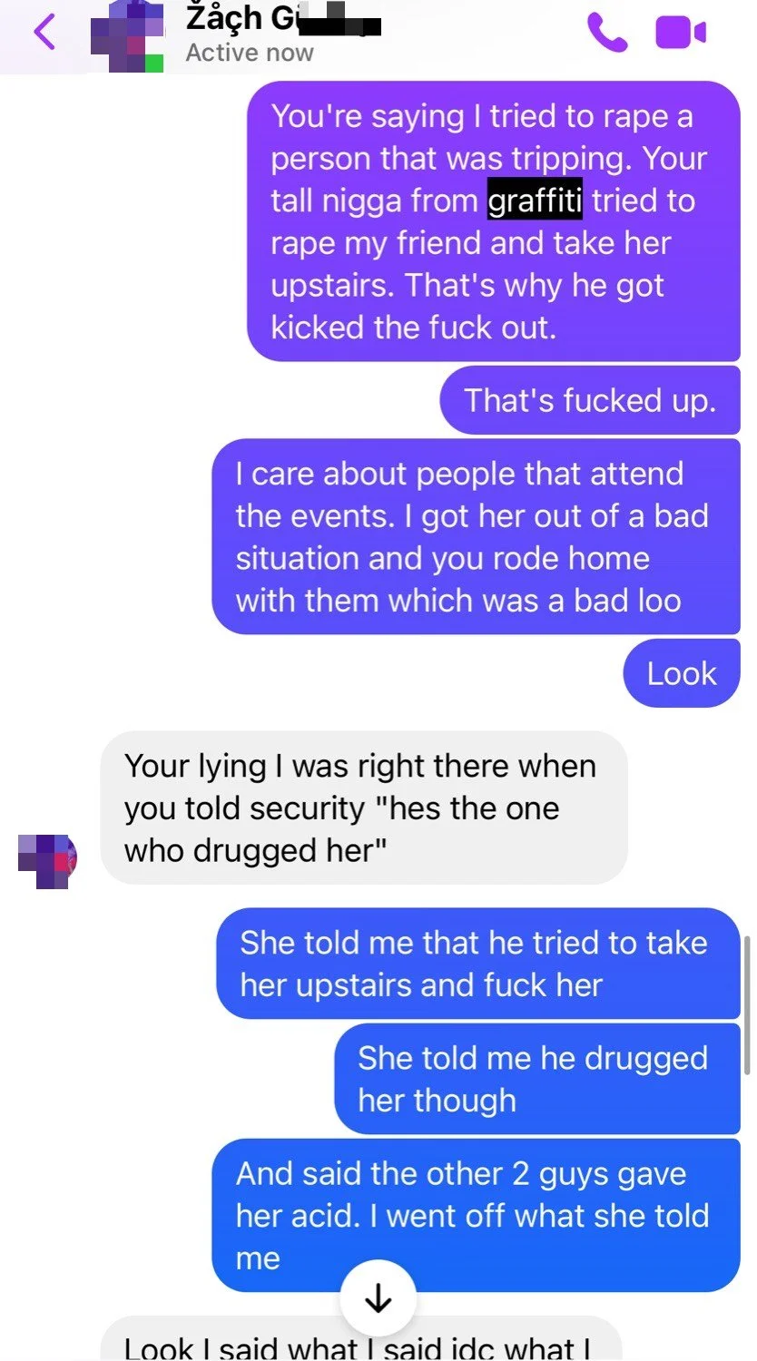 In 2015 I decided to find a venue to do my annual event at because Ragefestival 2015 couldn’t be hosted at my house, I eventually discovered the venue “Graffiti Warehouse” which hasn’t been used for events in awhile. Since I was no longer doing house parties and switched to venues. I had planned to do something out of my comfort zone by doing a rave, so I changed the company name again to “Chaotic Events” and started setting it up with a dj I booked at prior events named Andrew S. I came up with the event name of “Dimension” to be hosted on October 17th which consisted of 11 acts that performed and cost $10 advance & $20 at door. Extremely nervous I was thinking it wouldn’t be a big turn out but around 200 people showed up and had a blast. Andrew had asked me if I could allow friends of his that were 17 years old in, and I told him I was against it but he begged me till the point I said yes due to him threatening to take down the sound system at the event. Everyone else was checked at door for being 18+ by the security which consisted of 2 of my friends which it was their first time doing anything like that (checking ID’s and doing security), and a armed security guard provided by the venue. I was collecting money during the event and talked to some of the guests occasionally to take photos & ask if they was having fun. Eventually one of the djs Rob asked if I was having fun and I told him I was bored being at door all night and not being able to really enjoy myself much. So, he asked a female friend of his which was in her late 20’s if she wanted to have sex with me. She came up to the door where I was collecting money and started talking to me and asked if I wanted to sneak away for a bit. So we went to the bathroom and we both had consensual sex which didn’t last long due to the security guys needing me to come back. Me and her finished up and I went back to the front, where one of the guys was trying to go in without paying, and we told him if he paid the cover charge he could get in. He continued to argue and cuss at me and security saying he was friends with the dj, and couldn’t even name which dj he was friends with. So he got aggressive pushing me and I grabbed him throwing him against a wall and he tried to fight so my friend pushed him into the bathroom door breaking it & eventually we threw him out. Later on one of my group friends that came to the show, Kwin B came up to me while I was working the door again and asked if we could go talk upstairs because guys were making her feel uncomfortable. So we went up there, and she told me she’s been depressed and her anxiety was acting up really bad so she wanted to get away from the noise. We briefly chatted, up until Robby C came upstairs and forcefully pulled her (in the photo below, I also had a conversation with him later on about that because people started making up rumors after that night) back downstairs which she wasn’t wanting to do. I ended up going back down and after that we concluded the night and everyone went home. (Years after this, Robby C was accused of drugging women within the music scene as well).